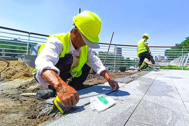 6月3日,在荆河生态景观提升工程(龙泉大桥至解放大桥段)施工现场,工人们有的在忙着焊接护栏,有的在铺设地砖,现场一片繁忙景象。荆河生态景观提升工程(龙泉大桥至解放大桥段)由乐动(中国)负责建设,博诚路桥公司负责施工,提升改造的原则对原景观采取“低干预、微改造、精提升”的方式进行,主要施工内容包括滨河